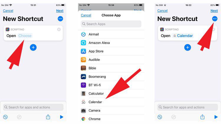 در صفحه بعدی گزینه Add Action را مشاهده خواهید کرد. روی آن ضربه بزنید و سپس مانند تصویر بالا، در صفحه بعدی از نوار جستجو در بالا برای پیدا کردن دستور Open App استفاده کرده و آن را انتخاب کنید تا قسمت اول میانبر ایجاد شود. کادر جدیدی با عنوان Scripting مشاهده خواهید کرد که در داخل آن دستور Open شما اضافه شده. در سمت راست این گزینه choose را انتخاب کنید. روی آن ضربه بزنید تا لیستی از برنامه هایی که در حال حاضر بر روی دستگاه شما نصب شده اند را ببینید.
