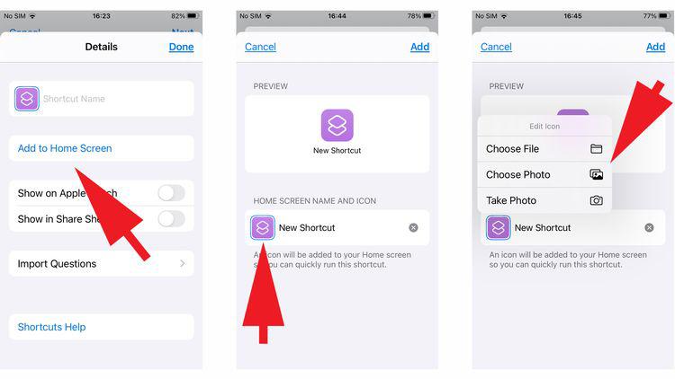 مانند تصویر بالا، روی آیکونی که در Home Screen Name and Icon نشان داده شده است، بزنید. منوی کوچکی را مشاهده خواهید کرد که دارای سه گزینه است. Choose File،Choose Photo و Take Photo. در اینجا می توانید آیکونی را که می خواهید استفاده کنید انتخاب کنید. اگر عکسی که از قبل دارید را می خواهید استفاده کنید،می توانید اندازه آن را متناسب با ابعاد آیکون تغییر دهید.ما مطمئن هستیم که با محبوبیت بیشتر این ویژگی، گزینه های بارگیری آنلاین زیادی اضافه خواهد شد. با انتخاب تصویر ، روی منطقه را در سمت راست آیکون جدید قرار دهید و به میانبر،نام برنامه مورد نظر برای راه اندازی آن را بدهید. سپس رویAdd button در گوشه بالا سمت راست و Done ضربه بزنید.