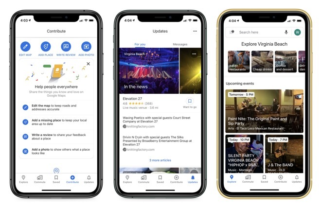 به نقل از اناردونی به عنوان یک اپ استور ایرانی برای دستگاههای iOS، دادههای نقشهبرداری Google Maps همیشه توسط گوگل بهروز میشوند، کاری که اپل در انجام آن خوب عمل نکرد. با تغییر زبان طراحی گوگل به متریال، اپلیکیشن Google Maps هم با این زبان بازطراحی شده است و هماکنون امکانات این اپ در 5 بخش دسته بندی شده اند: Explore (نقشه)، Commute (مکان های ثبت شده)، Saved (مکان های ذخیره شده)، Contribute (همفکری کاربران) و Updates (بهروزرسانی ها).