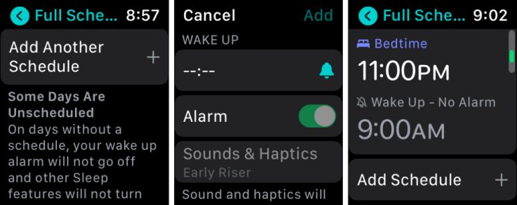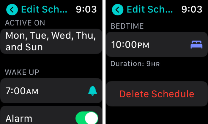 شما میتوانید زمانبندی فعلی را مانند آیفون روی اپل واچ خود هم تغییر دهید. اپلیکیشن اسلیپ را اجرا کنید و روی Full Schedule کلیک کنید. سپس روی صفحه Edit Schedule را بفشارید. روزها یا ساعتها را تغییر دهید، یک زنگ هشدار اضافه کنید یا در صورت لزوم از پایین صفحه زمانبندی را حذف کنید.