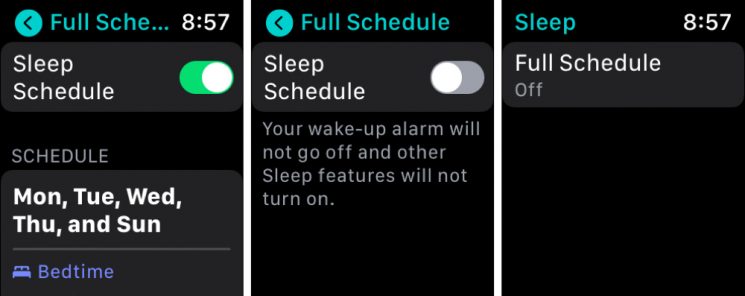 شاید شما بخواهید زمانبندی خواب را از طریق اپل واچ خود خاموش کنید. برای این کار کافیست وارد برنامه Sleep شوید و Sleep Schedule را به وضعیت خاموش درآورید. خبر خوب اینکه شما میتوانید مجدداً در زمان دیگری به همین صفحه بیایید و زمانبندی خواب را فعال کنید.