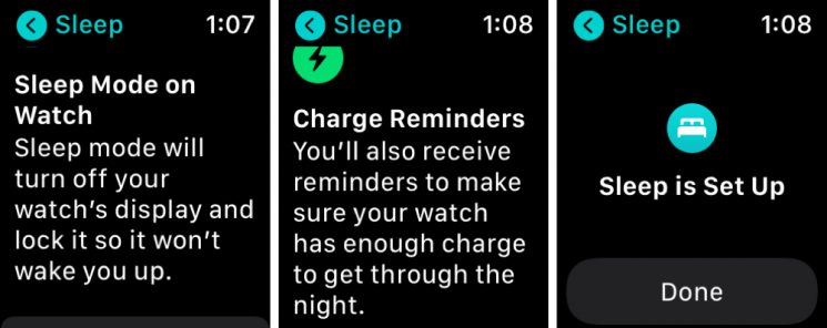 در اینجا از شما پرسیده میشود آیا میخواهید Time sleep Tracking را فعال کنید یا خیر. سپس Charge Reminders را دریافت خواهید کرد که اگر اپل واچ شما برای شب تا صبح ۳۰ درصد یا کمتر شارژ داشته باشد به شما یادآوری شود یا خیر.