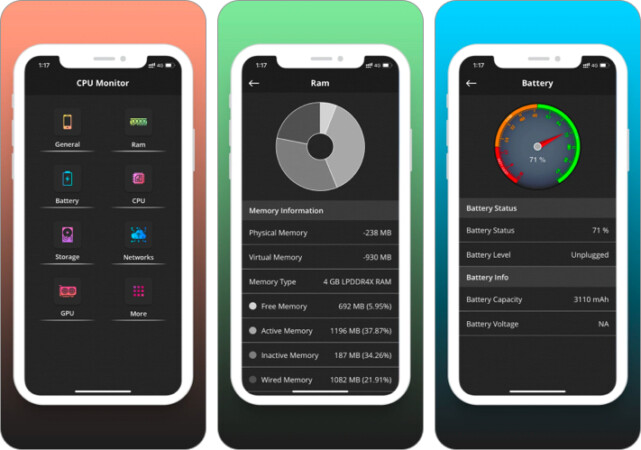اپلیکیشنی ایده‌آل برای بررسی کامل پس‌زمینه‌ آیفون شما است. این برنامه شامل خدمات نظارت عمیق برای باتری‌ها و پردازنده‌ها، رابط شبکه، واحد پردازش گرافیکی GPU، CPU، سلامت سیستم عامل و ذخیره‌سازی است. سپس آمار به دست آمده را در نمودارهای مختصر و آموزنده بررسی می‌کند. دانستن این موارد مفید است، زیرا همه مواردی هستند که بر عمر مفید باتری آیفون تاثیر گذارند.