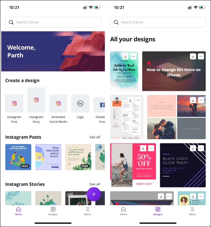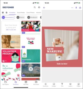 اپلیکیشن Desygner با برخورداری از بهترین رابط کاربری، به عنوان بهترین اپلیکیشن طراحی و گرافیک برای آیفون و آیپد شناخته شده است. بله، هیچ هم اغراق نمیکنیم. کلکسیون قالبها به صورت خیلی منظم به دو دسته کلی Social و انواع Template ها تقسیم شده است. شما حتی میتوانید از انتخاب قالب صرف نظر کنید و فرمت دلخواه خود را بسازید.