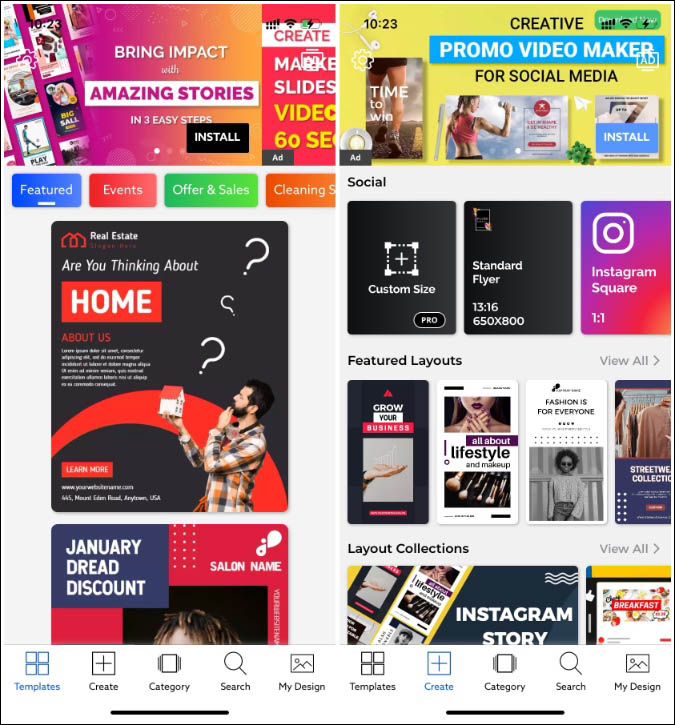 همانطور که از نام این برنامه پیدا است (آگهیساز)، Flyer Maker مخصوص طراحی آگهیهای تبلیغاتی به صورت پرتابل است. با باز کردن برنامه به طور پیشفرض، به گالری قالبهای برنامه هدایت میشوید. از همانجا میتوان بر طبق دستههای Fitness، Insurance، Fashion، Education و … طرح دلخواه خود را انتخاب کرد.