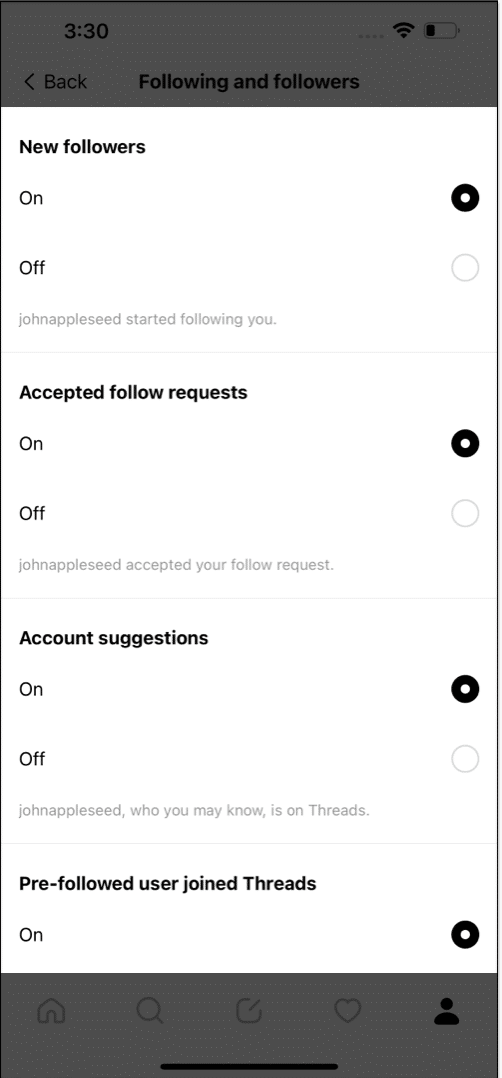 - در این بخش میتوانید تمامی نوتیفیکیشنهای مربوط به افراد مختلف مانند فالورهای جدید، فالو ریکوئستهای پذیرفته شده، پیشنهادات اکانتها و همچنین افرادی که از قبل در تردز حاضر بودند را بپذیرید و یا رد کنید.