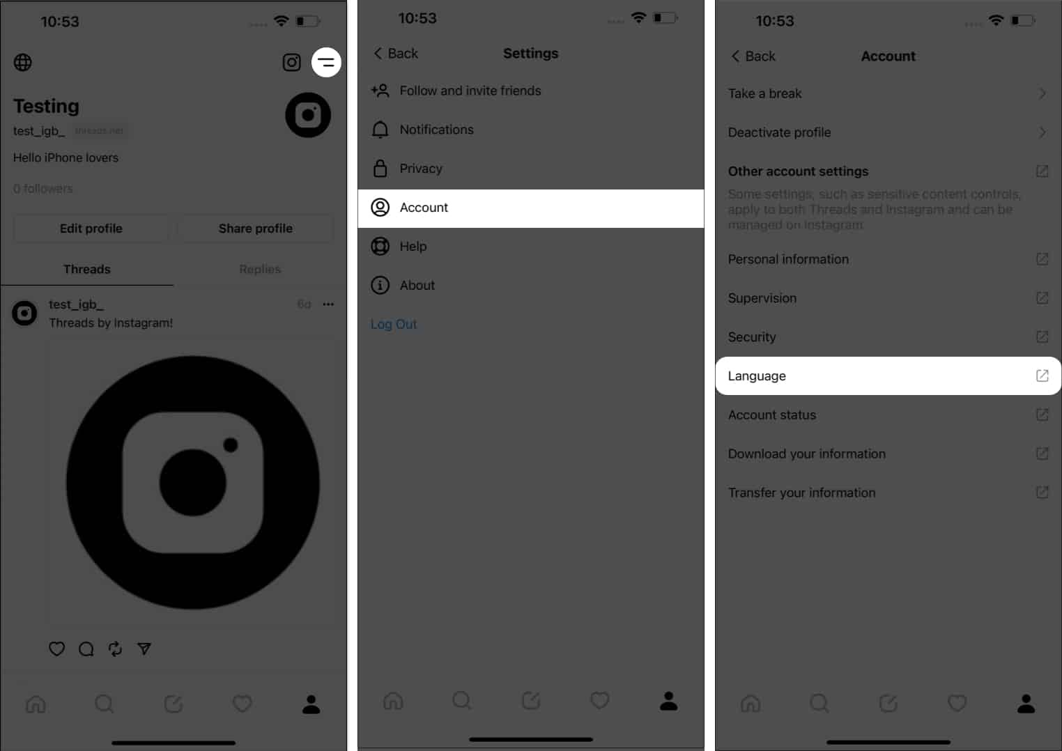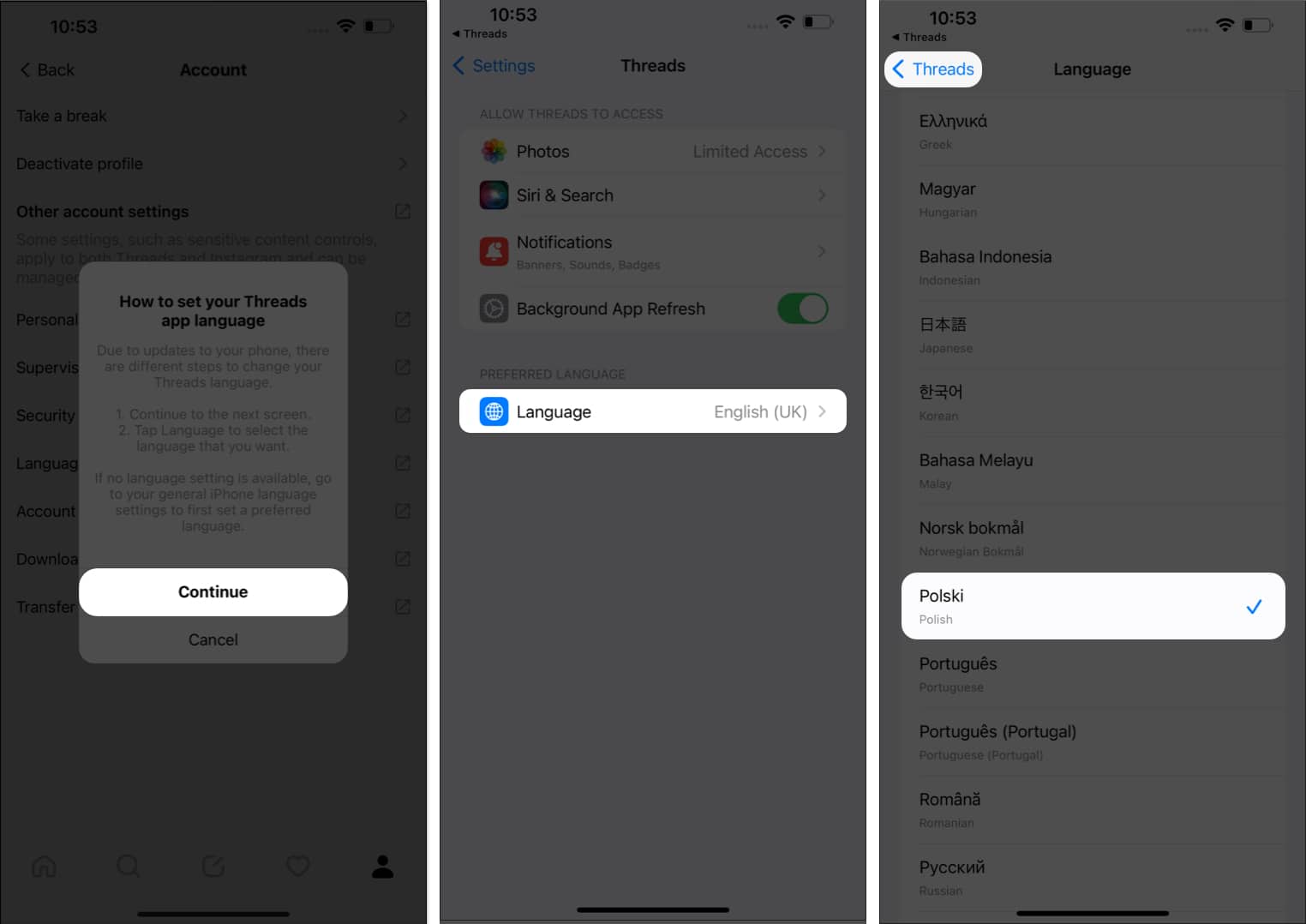 - زبان مورد نظر را انتخاب کنید و با کلیک بر روی Threads به تردز برگردید.
