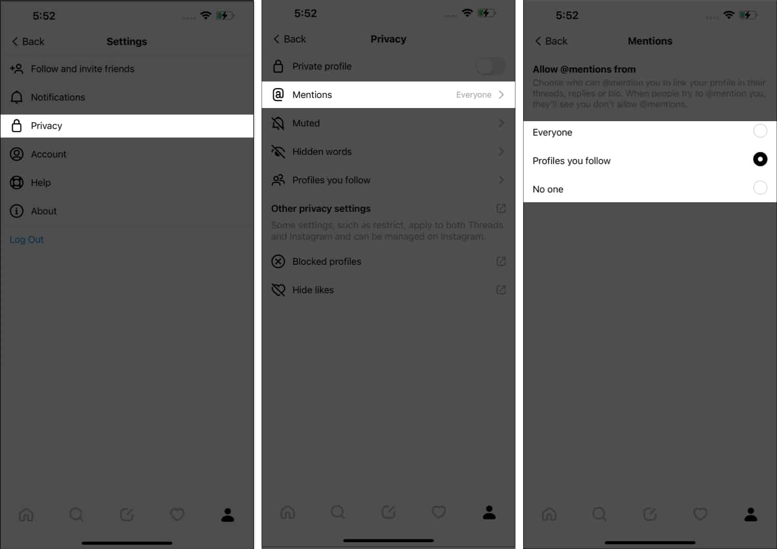 - بر روی Privacy و سپس Mentions ضربه بزنید.