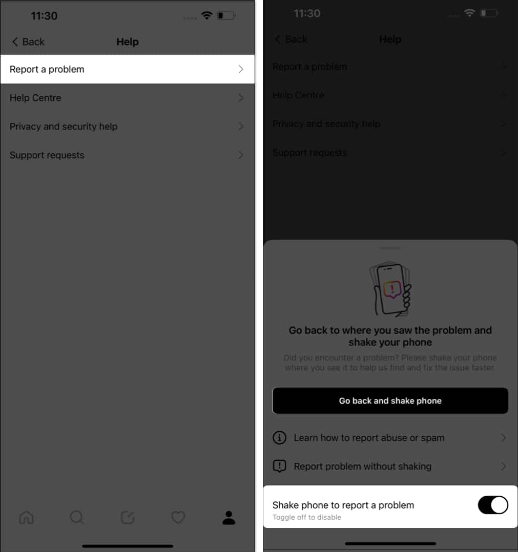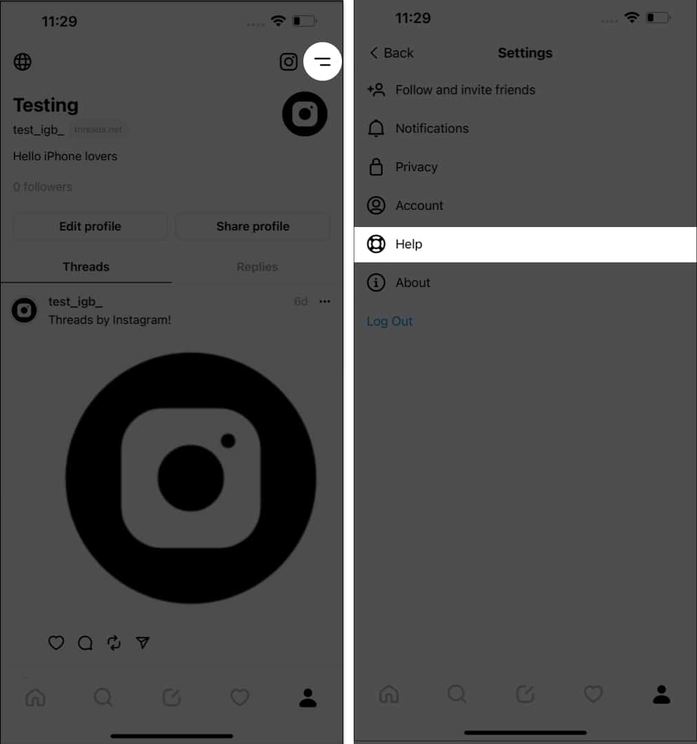 - به پروفایل خود بروید و سپس بر روی آیکن منو (دو خط روی هم) و در نهایت گزینه Help کلیک کنید.