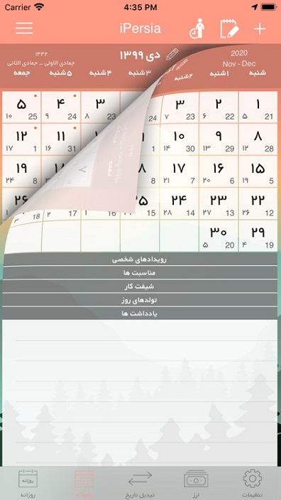 تقویم ارز iPersia Calendar Arz بهترین و کاملترین اپلیکیشن تقویم فارسی برای آیفون است. شما میتوانید این اپلیکیشن تقویم فارسی را به صورت رایگان برای آیفون خود دانلود کنید. شما علاوه بر مشاهدهی تقویم ماهانه و روزانه آن به 3 مدل مختلف (شمسی، قمری و میلادی)، میتوانید تاریخهای مختلف را به هم تبدیل کنید. همچنین خواهید توانست رویدادهای مهمی مثل روز تولد دوستان، جلسات مهم و … را به آن اضافه کنید.