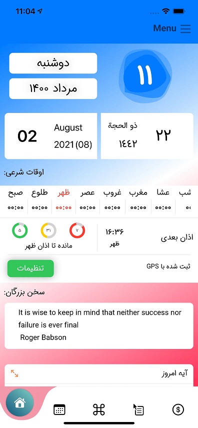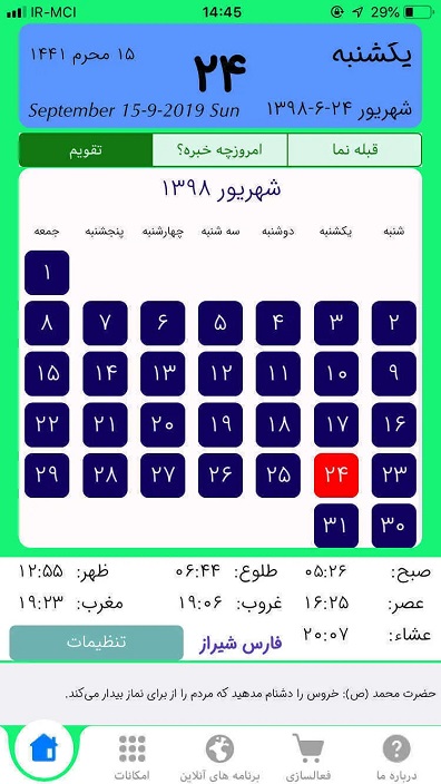 تقویم فارسی اذانگوی پارسیان همچنین به شما جهت دقیق قبله و موقعیت جغرافیایی را نشان میدهد. این تقویم همچنین از ویجت روی صفحه نیز پشتیبانی میکند. شما میتوانید آن را فعال کنید و روز، مناسبت، حدیث روز و … را روی صفحه اصلی آیفون خود مشاهده کنید.