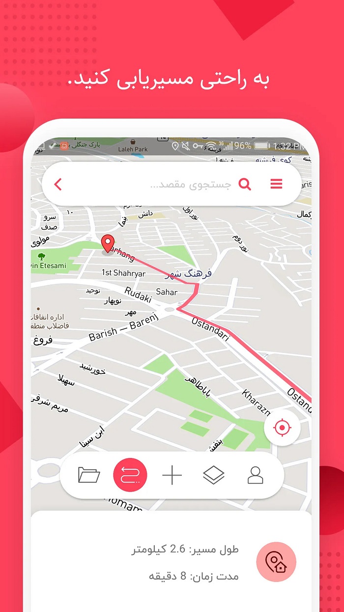 برنامه موقعیت‌یاب ویژن همان‌طور که از نامش پیدا است، فقط یک مسیریاب نیست. شما می‌توانید نام مکان‌های مورد نظر خود را در بخش جستجو تایپ کنید و تأیید را بزنید تا بهترین مسیر برای شما نمایش داده شود.