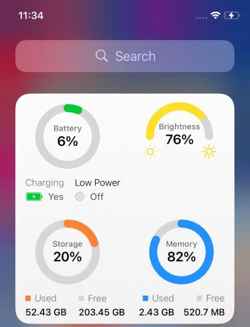 این ویجت به شما کمک میکند تا وضعیت باتری، روشنایی، حافظه و اطلاعات کلی آیفون خود را کنترل کنید. برای گسترش جذابیت بصری این اطلاعات، برنامه رنگهای زیادی را برای انتخاب در اختیار شما میگذارد. فقط برنامه Battery Widget & Color Widget را دانلود کرده و پس از نصب میتوانید ویجت را سفارشی کنید. همانطور که گفتیم، اندازه و رنگهای زیادی نیز برای انتخاب وجود دارد.