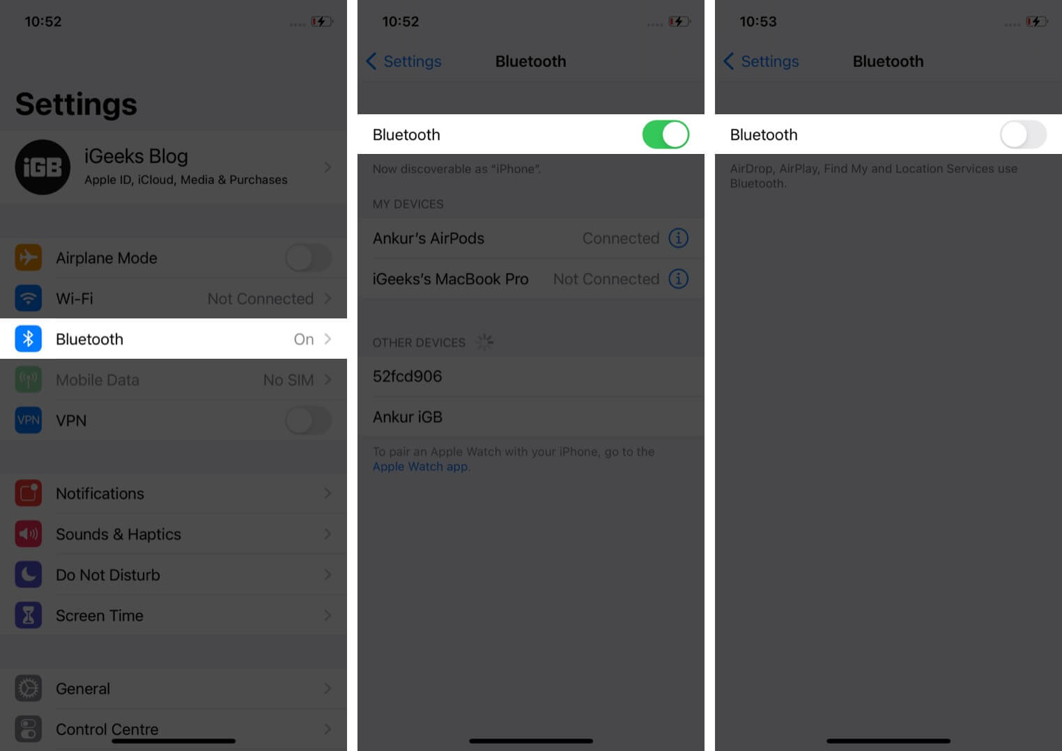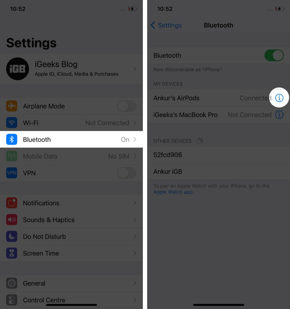 • اکنون دستگاه بلوتوث را مجددا متصل کنید. برای این کار به Settings بروید و گزینه Bluetooth را لمس کنید. برای اکثر هدفون‌ها و بلوتوث‌ها باید دکمه‌ی جفت سازی را فشار دهید و یا برای چند ثانیه آن را نگه دارید. سپس وقتی نام دستگاه را در آیفون‌تان مشاهده کردید، روی آن ضربه بزنید. برای جفت شدن ایرپاد راهنمای مربوط به آن را مطالعه کنید.