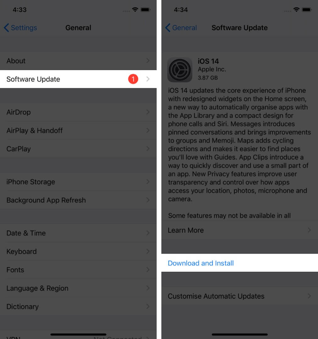 برای این‌کار، ابتدا به Settings سپس General بروید. Software Update را انتخاب کنید. بررسی کنید که آیا به بروزرسانی نیاز دارید یا خیر. اگر جواب بله است، روی Download and Install یا Install Now ضربه بزنید.