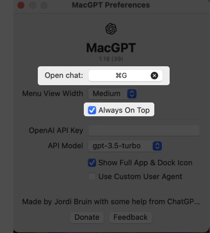 • برای ایجاد یک شورتکات کیبورد، MacGPT را باز کرده سپس به Preferences و بعد Settings بروید. روی فیلد نوشتاری در کنار Open chat کلیک کنید. حال ترکیب کلید مورد نظرتان را فشار دهید. توجه داشته باشید که تنها زمانی میانبر کار می‌کند که MacGPT در پس‌زمینه در حال اجرا باشد.