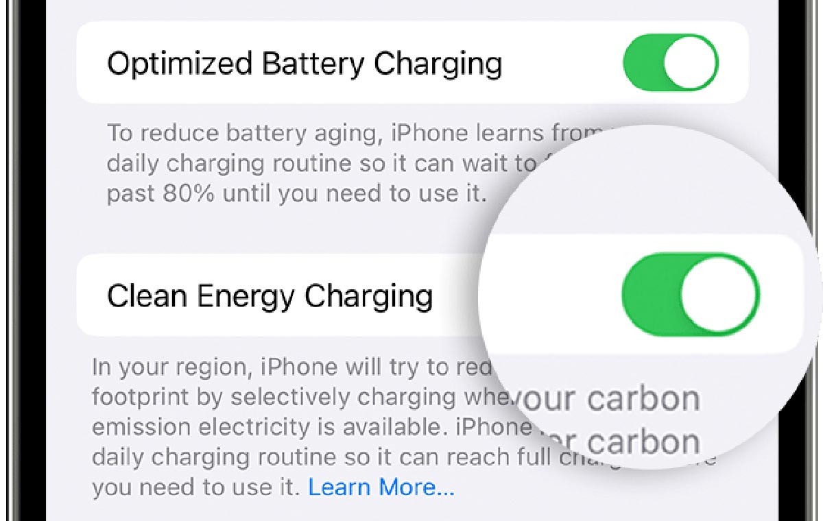 زمانی که ویژگی شارژ انرژی پاک را در تلفن همراه خود فعال کردهاید و آن را به شارژ میزنید، میزان انتشار کربن در شبکه انرژی محلی تلفن همراه شما پیش بینی میشود و به واسطه این پیش بینی و بررسی انجام شده، آیفون با استفاده از انرژی پاکتر شارژ خواهد شد.