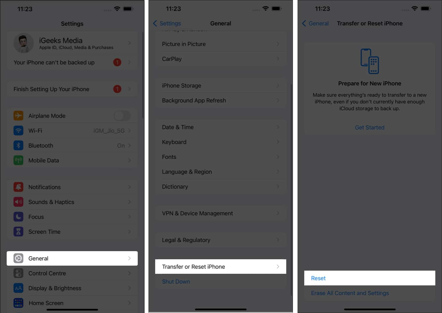 - روی General ضربه بزنید و به Transfer or Reset iPhone بروید.