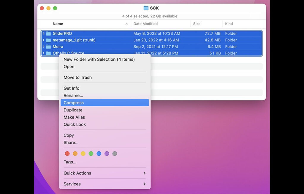 اما اغلب نیازی به باز کردن مستقیم آن ندارید. به جای آن یک یا چند فایل یا پوشه را با هم انتخاب کنید سپس روی آنها Control-click کنید یا در Finder مک او اس روی آنها راست کلیک کنید. حال از منوی باز شده Compress را انتخاب کنید.