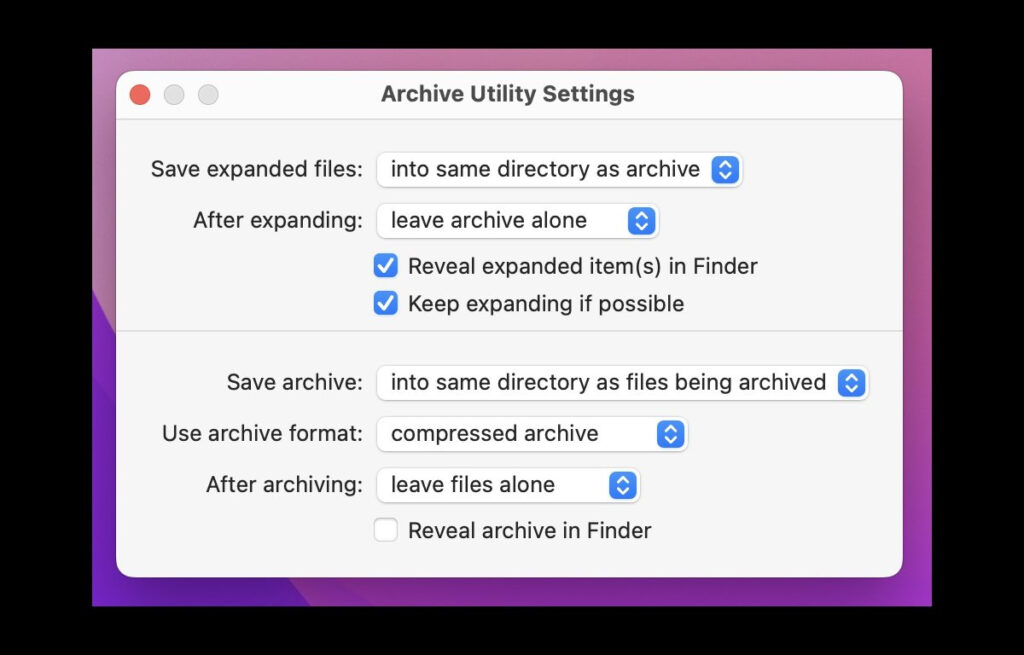 یک پنجره تنظیمات در Archive Utility وجود دارد که میتوانید آن را باز کرده و از طریق آن پیشفرضهایی را تنظیم کنید. شما میتوانید موارد زیر را به صورت پیشفرض تنظیم کنید: