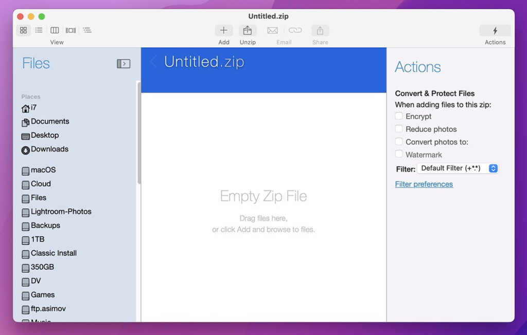 یکی از ابزارهای جالب zip. در اپ استور مک ZipMounter Lite است. با استفاده از این ابزار میتوانید فایلهای .zip را به عنوان درایورهای فقط خواندنی روی دسکتاپ خود نصب کنید. به طوری که انگار درایورهای محلی هستند و میتوانید محتویات آرشیو جداگانه را به حجمهای دیگر یا دسکتاپ بکشید.