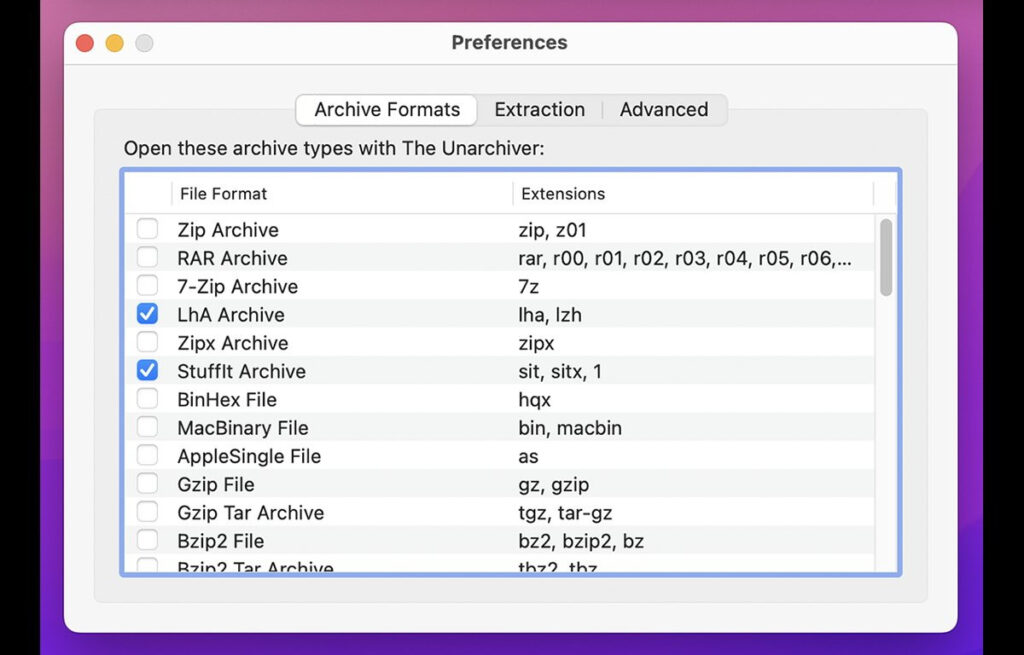 بعد از Stuffit expander شناخته شدهترین برنامه Unarchiver است که در Mac App Store نیز موجود است. Unarchiver به شما امکان میدهد که با پسوند نام فایل و با دو بار کلیک کردن روی نام فایل در Finder، تعیین کنید که کدام فایلها باز شوند و کدام فایلها به طور پیشفرض باز نشوند.