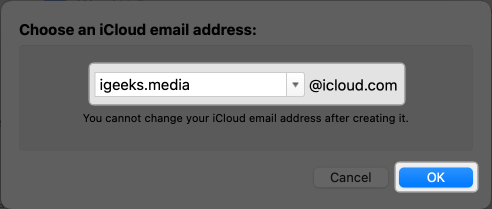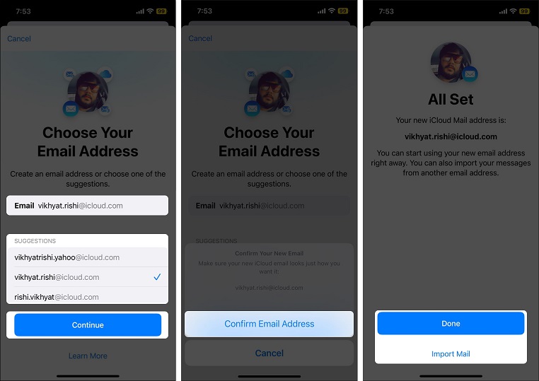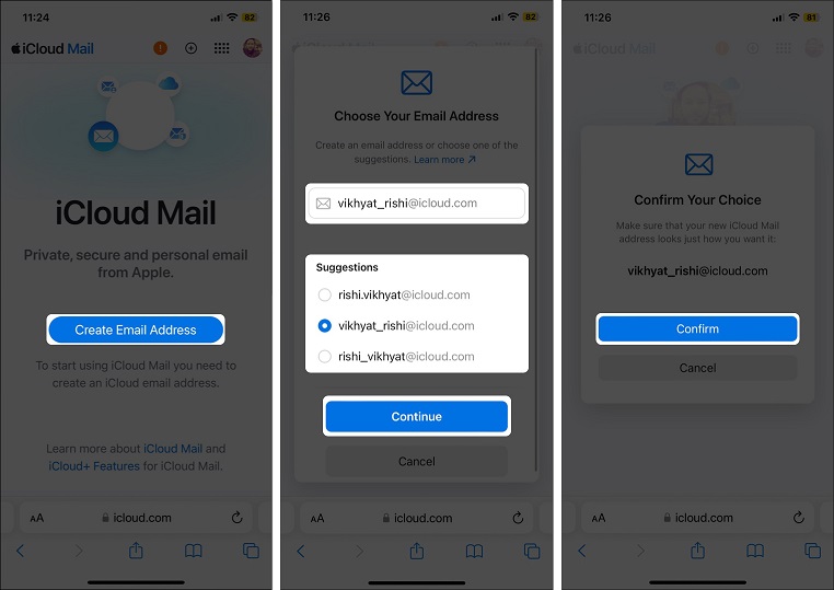 - اکنون اسم مورد نظر برای ایمیل آیکلود خود را انتخاب کرده و در نهایت بر روی Continue کلیک کنید.