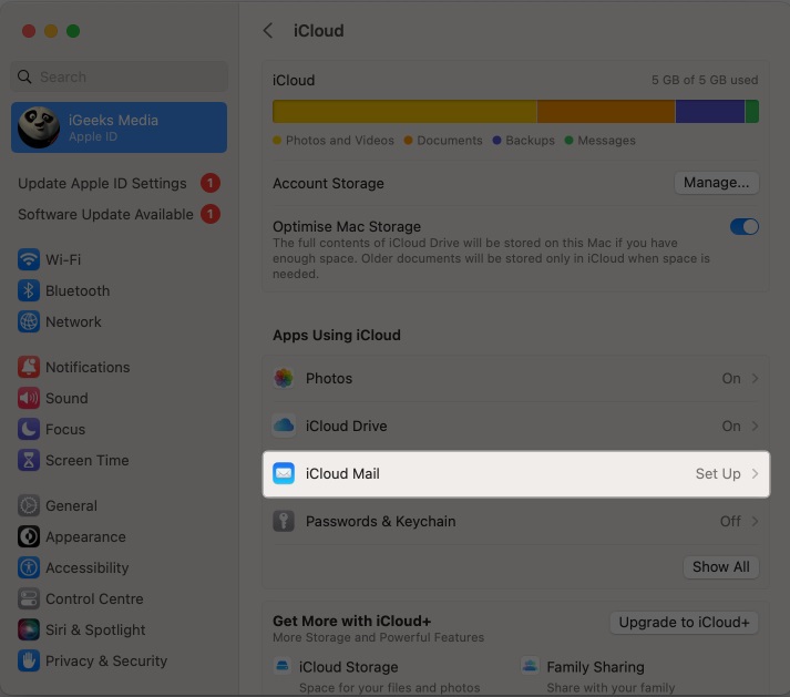 - در قسمت Apps Using iCloud، گزینه iCloud Mail را انتخاب کنید.