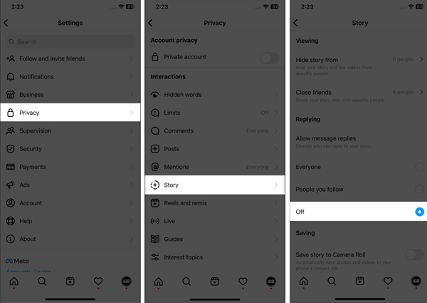 پیش از انتشار میتوانید در پروفایل اینستاگرام روی منوی سهخط گوشهی بالایی نمایشگر بزنید و پس از اسکرول به پایین روی بخش Comments (کامنتها یا نظرات) بزنید. روی قسمت Stories (استوریها) بزنید. برای خاموش کردن کامنت استوری، گزینهی Off (خاموش) را انتخاب کنید. با اینکار به طور کلی کامنت استوری شما خاموش می شود.