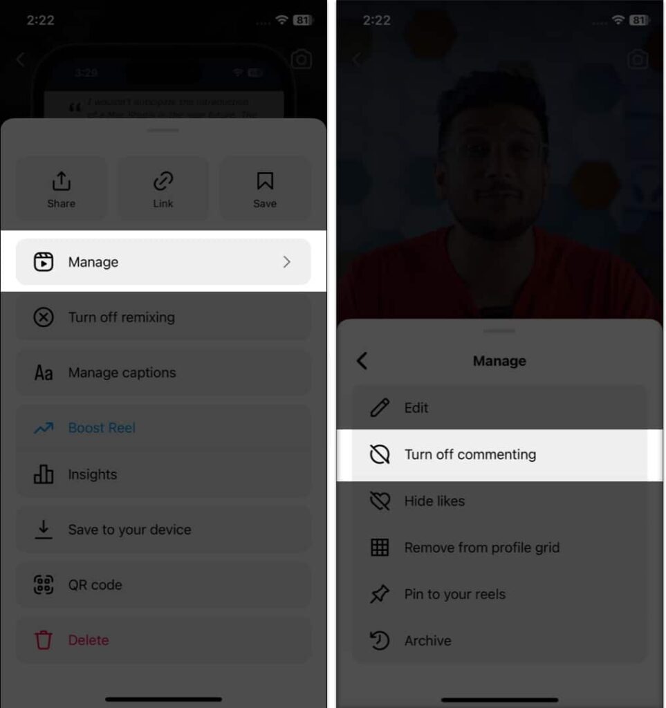 نکته: در صورتی که قصد دارید بخش نظرات اینستاگرام را برای همان ریلز فعال کنید، همان مراحل فوق را انجام دهید و در قسمت Manage، گزینه Turn on Commenting را انتخاب کنید.
