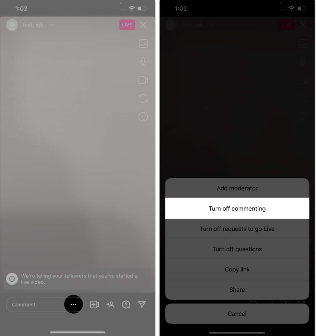 غیرفعال کردن کامنت ها در اینستاگرام آیفون و در قسمت Live