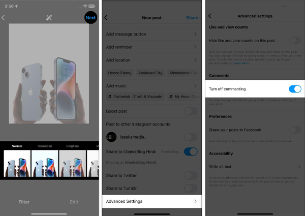 غیرفعال کردن کامنت ها در اینستاگرام آیفون قبل از ارسال یک پست در فید