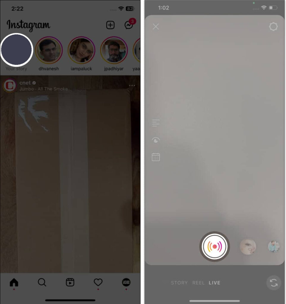 - در تلفن همراه خود، اپلیکیشن اینستاگرام را اجرا و سپس Your Story را انتخاب کنید. (اگر قبلاً یک استوری گذاشتهاید، باید در این قسمت مجدداً بر روی Your story (+) ضربه بزنید.)