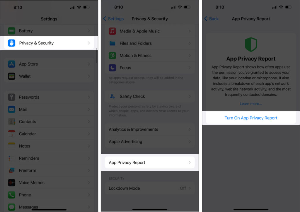 Privacy & Security → App Privacy Report → turn on App Privacy Report