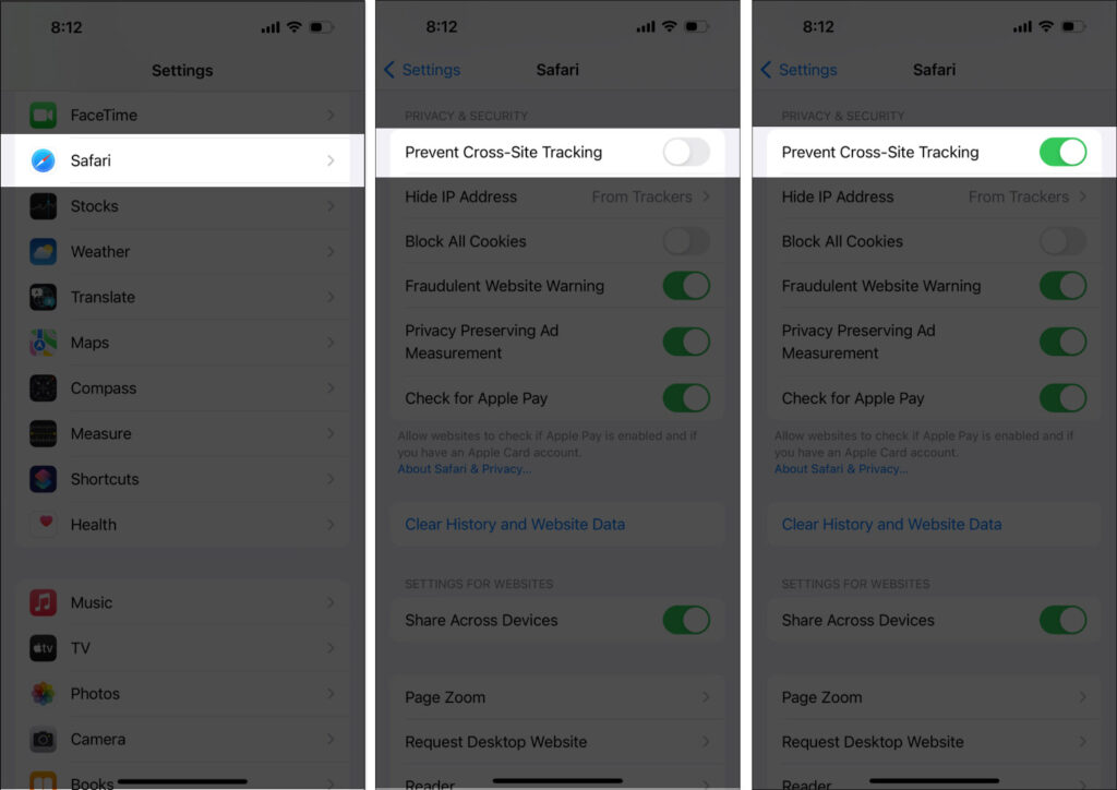 - در زیر قسمت Privacy & Security، گزینه Prevent Cross-Site Tracking را به حالت روشن (ON) تغییر دهید.