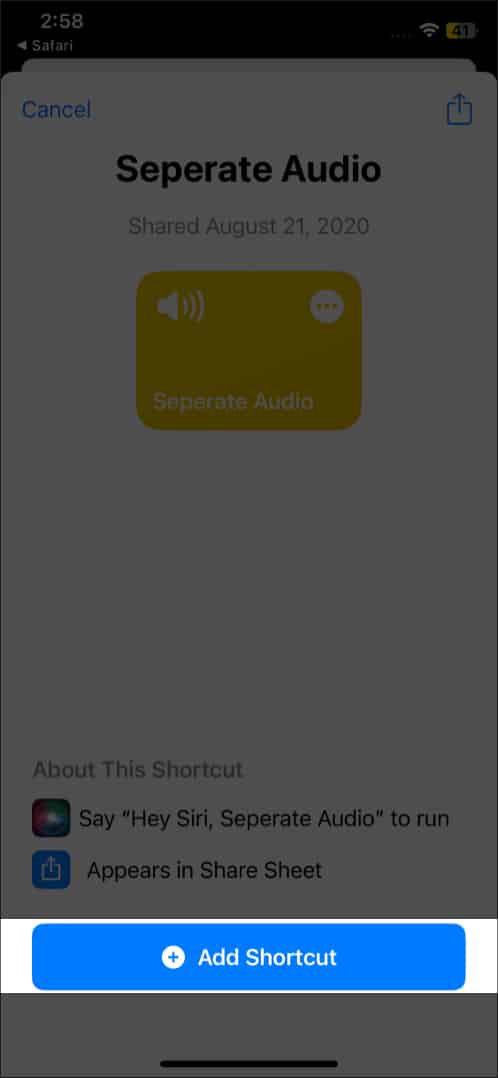 - بر روی audio-extracting shortcut کلیک کنید. با این کار به برنامه Shortcuts هدایت میشوید.