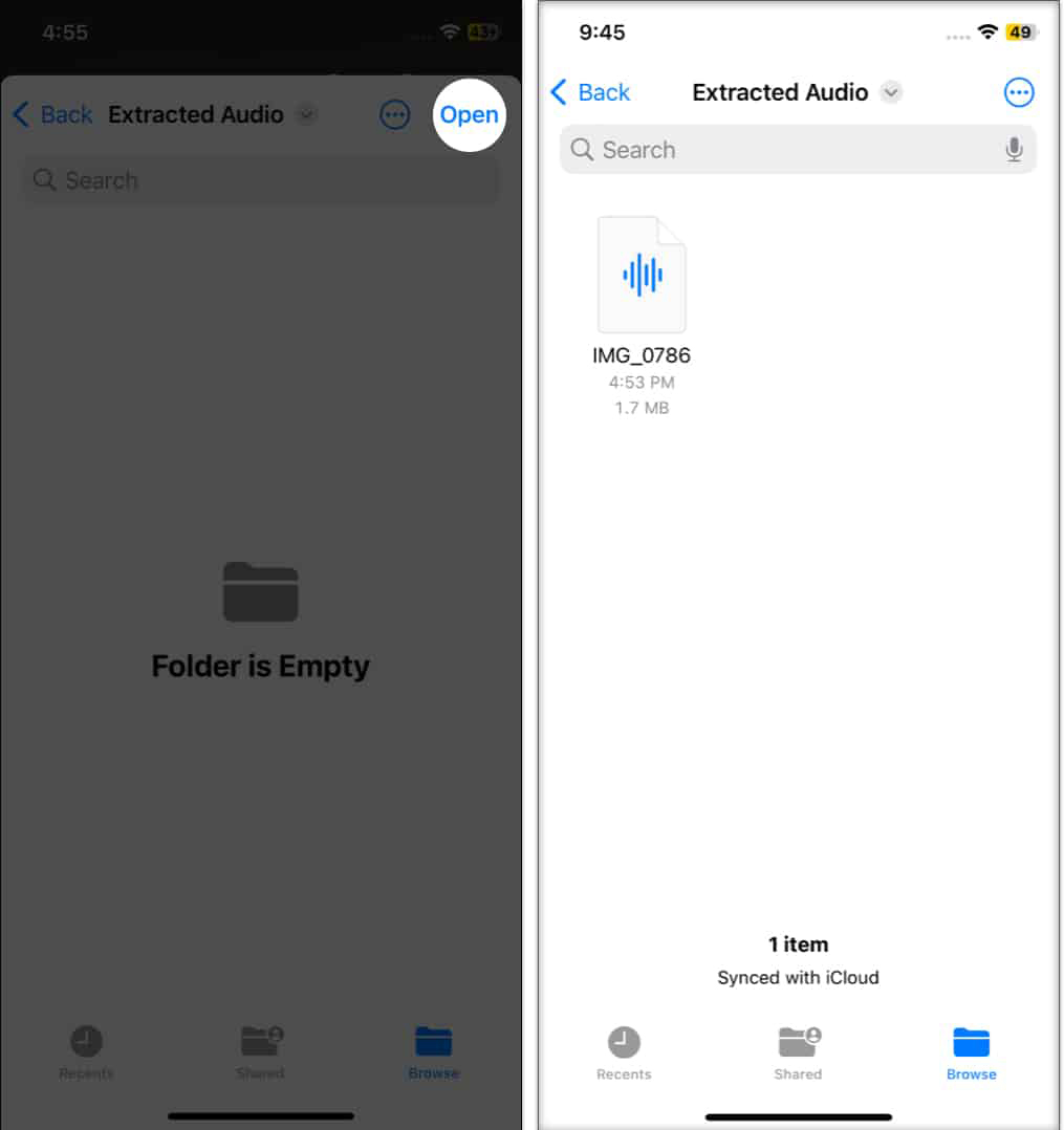 عملیات جدا کردن صدا از فیلم تمام شد. در حال حاضر میتوان کلیپ صوتی استخراج شده را تغییر نام داد و با دوستان خود به اشتراک گذاشت. علاوه بر این، میتوان با استفاده از دستورات صوتی سیری به Shortcut دسترسی داشت.