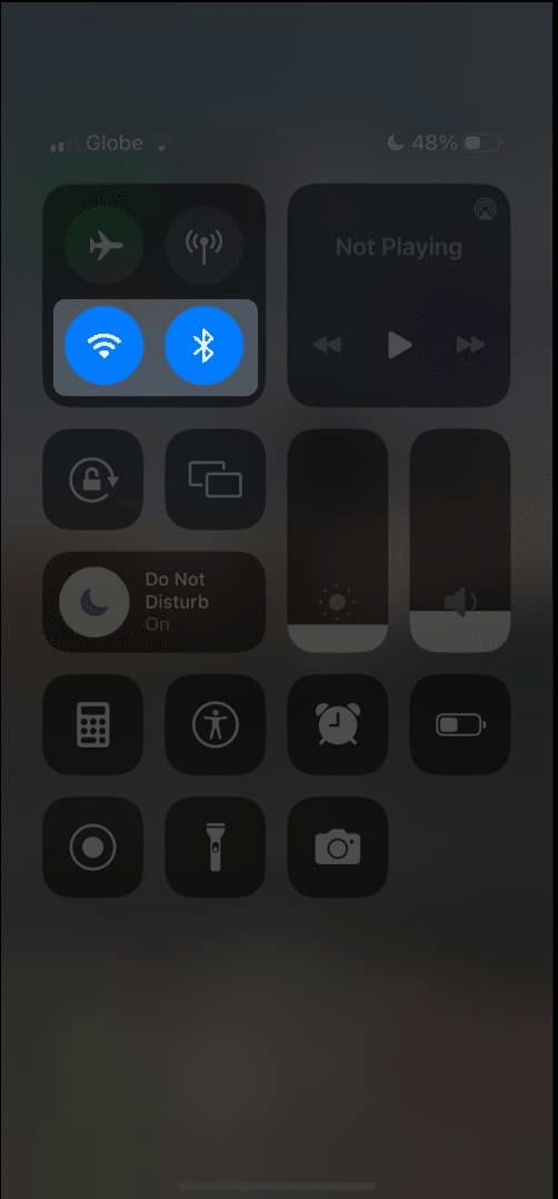 در کنترل سنتر آیفون وای فای و بلوتوث را روشن کنید