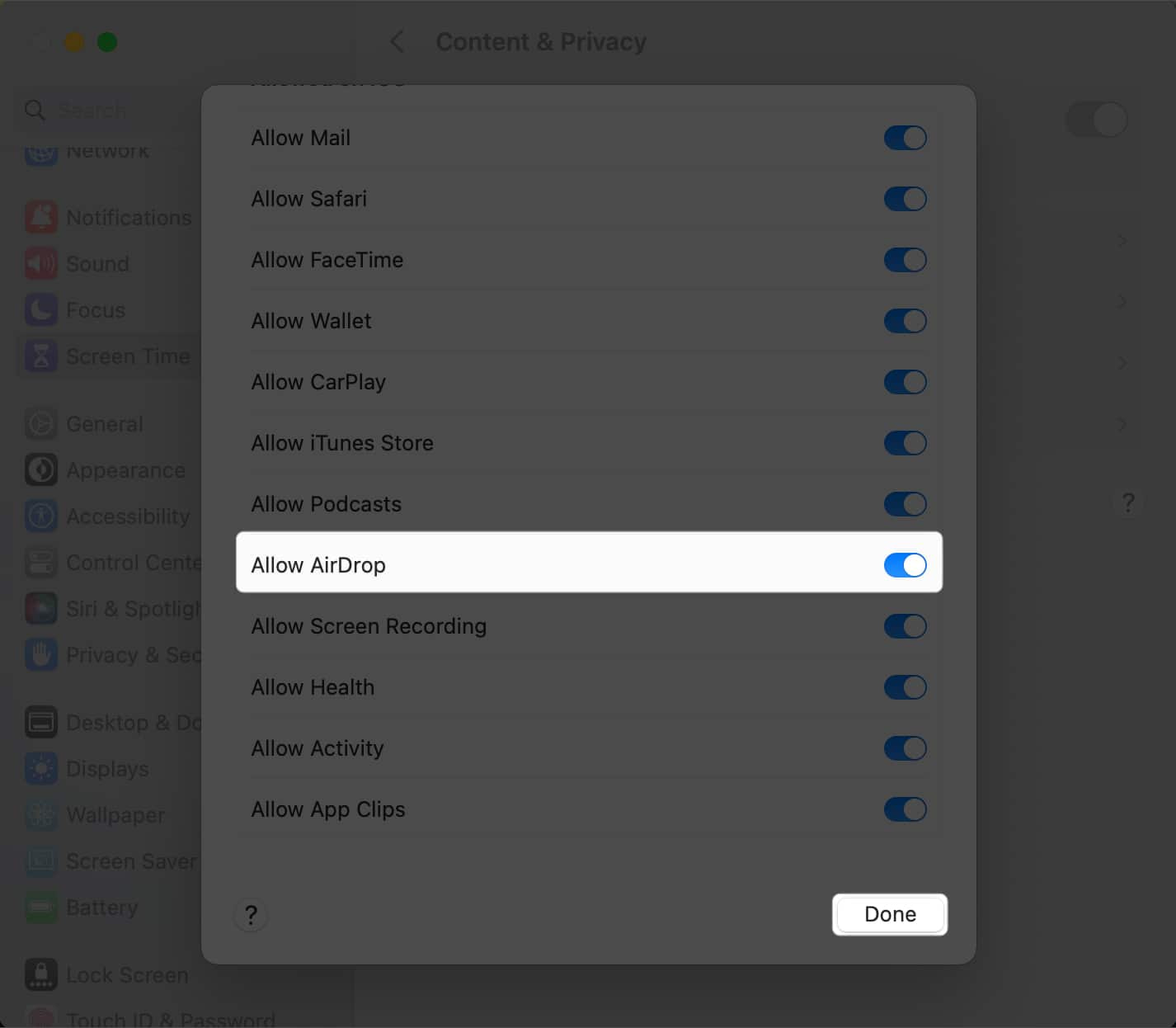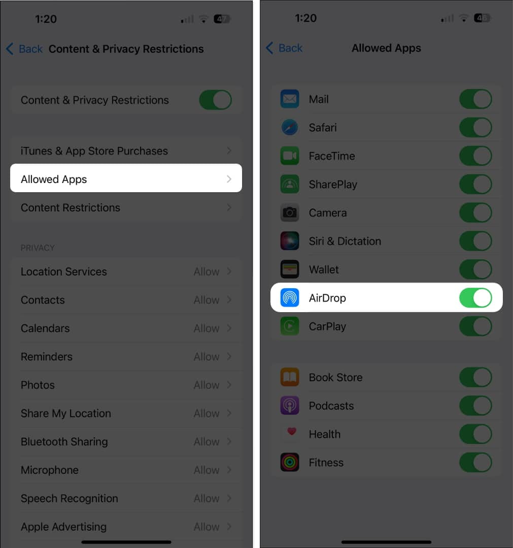 1. Allowed Apps را انتخاب کنید. حال بررسی کنید که AirDrop فعال باشد.