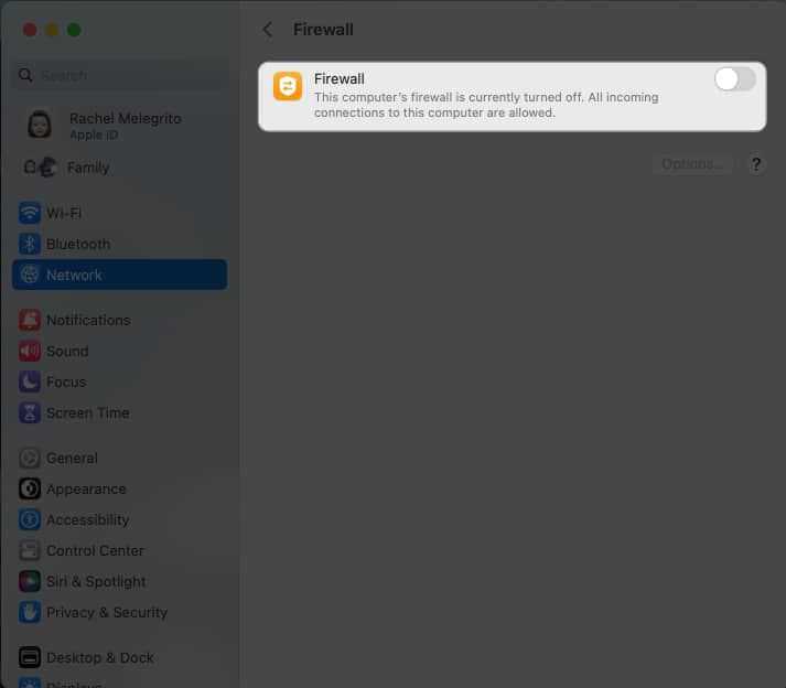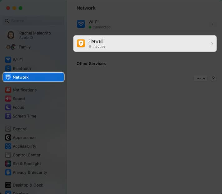 1. در مک خود به Settings رفته، Network را انتخاب کرده و روی Firewall کلیک کنید.