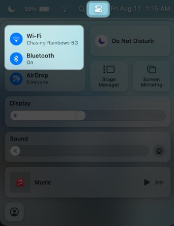 •  در مک نیز روی نماد کنترل سنتر در نوار منو کلیک کنید. حال روی نماد بلوتوث و Wi-Fi ضربه بزنید تا روشن شده و به رنگ آبی در بیاید.