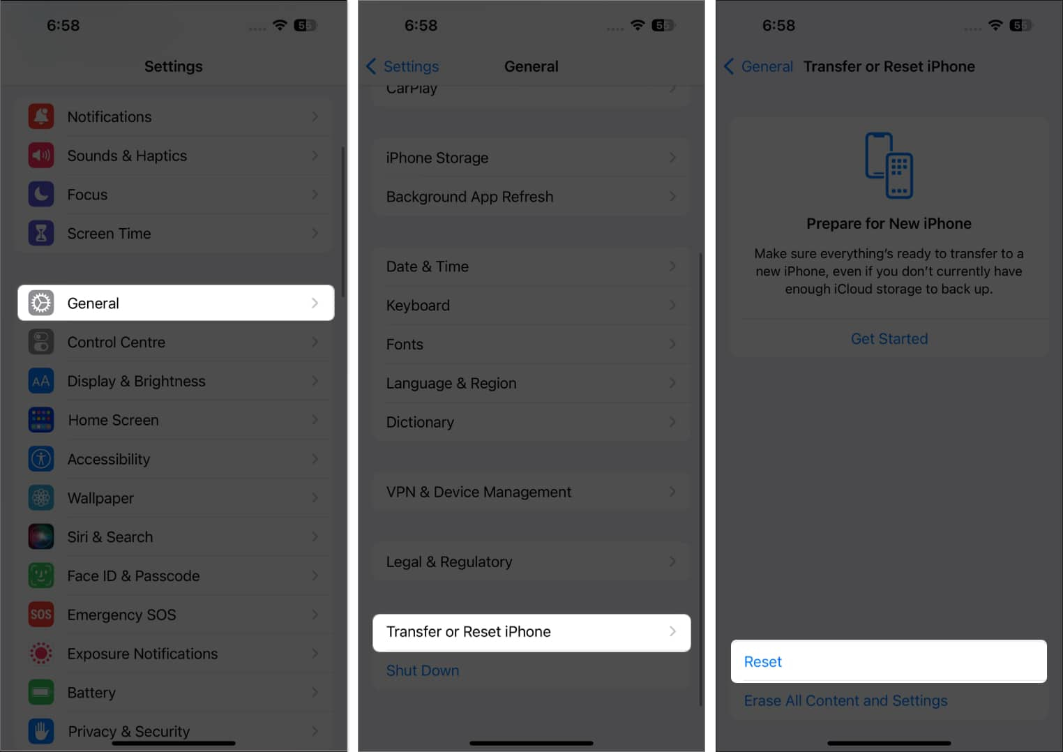 Transfer or Reset را انتخاب کرده و روی Reset ضربه بزنید