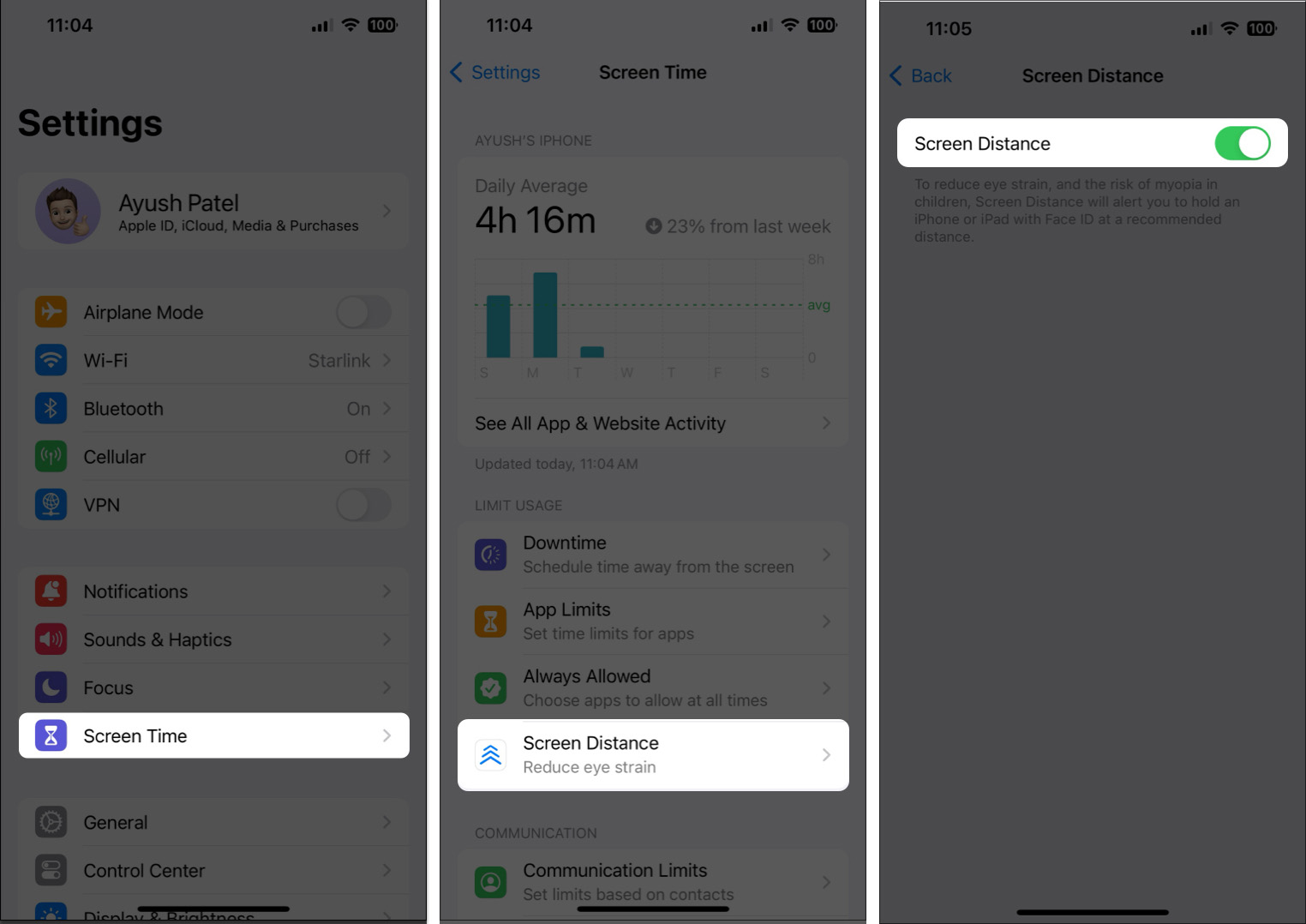 - به Settings دستگاه رفته، پس از کلیک بر روی Screen Time، به Screen Distance بروید.