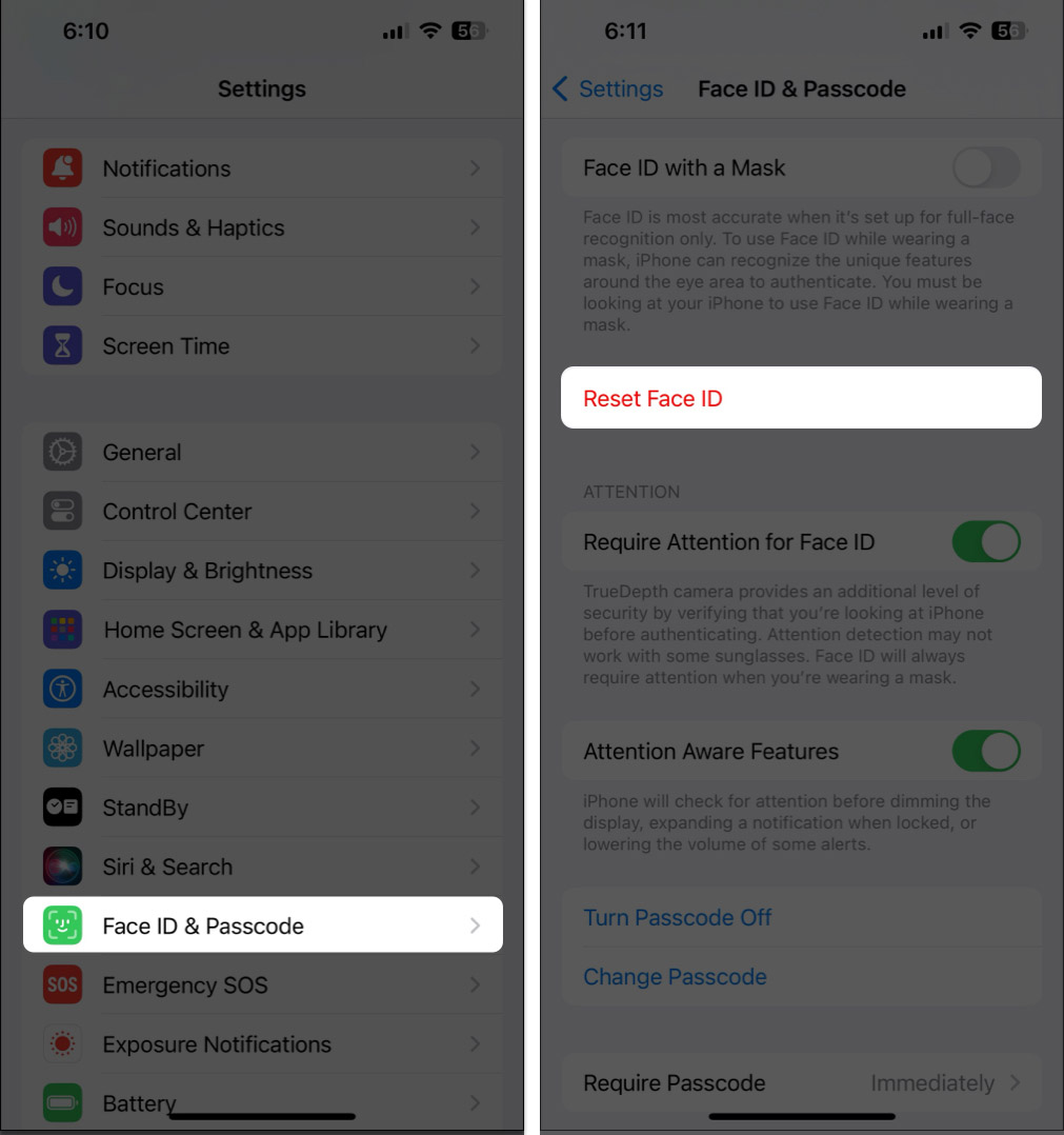 اگر با طی کردن مراحل بالا، هنوز هم قابلیت Screen Distance آی او اس 17 در آیفون شما به درستی عمل نمیکند، بهتر است Face ID را ریست کنید، زیرا هر دو ویژگی مذکور از دوربین TrueDepth استفاده میکنند. برای ریست کردن فیس آیدی، مراحل زیر را انجام دهید: