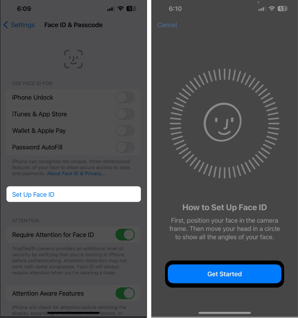 - در این مرحله، بعد از کلیک بر روی Set Up Face ID، عبارت Get Started را انتخاب کنید.