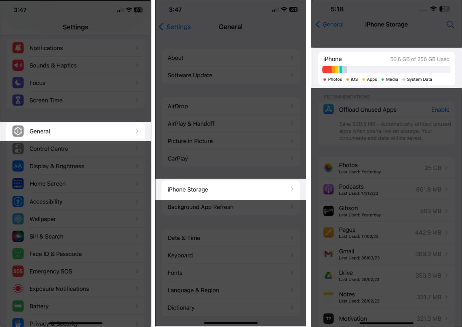 یکی از اصلیترین دلایل برای عدم بارگیری فایلها در آیفون، نداشتن فضای خالی برای ذخیره سازی است. برای حل مشکل دانلود نشدن فایل ها در آیمسیج نیز باید فضای آیفون خود را بررسی کنید.