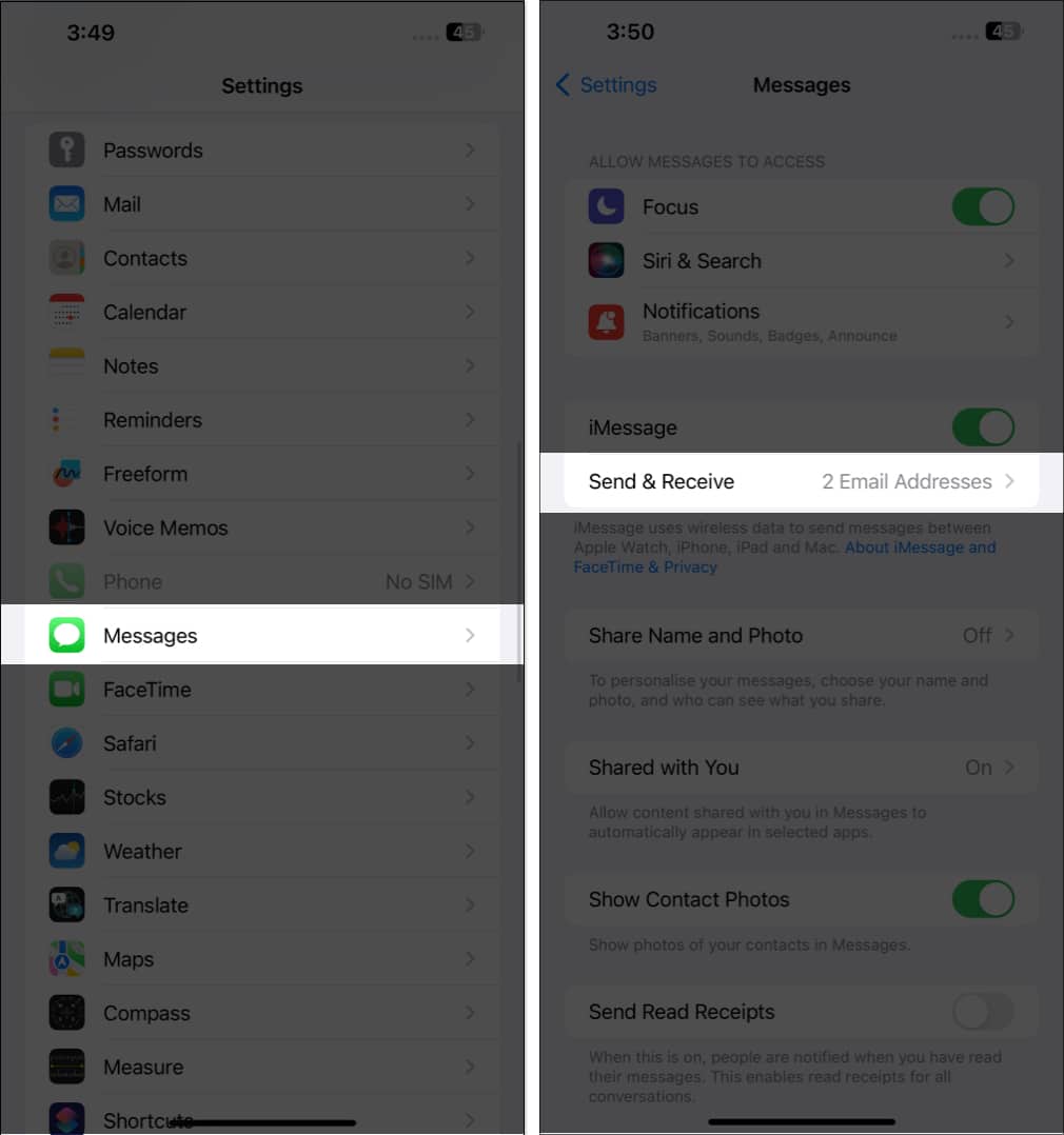 - پس از باز کردن Settings و انتخاب Messages، بر روی Send & Receive کلیک کنید.