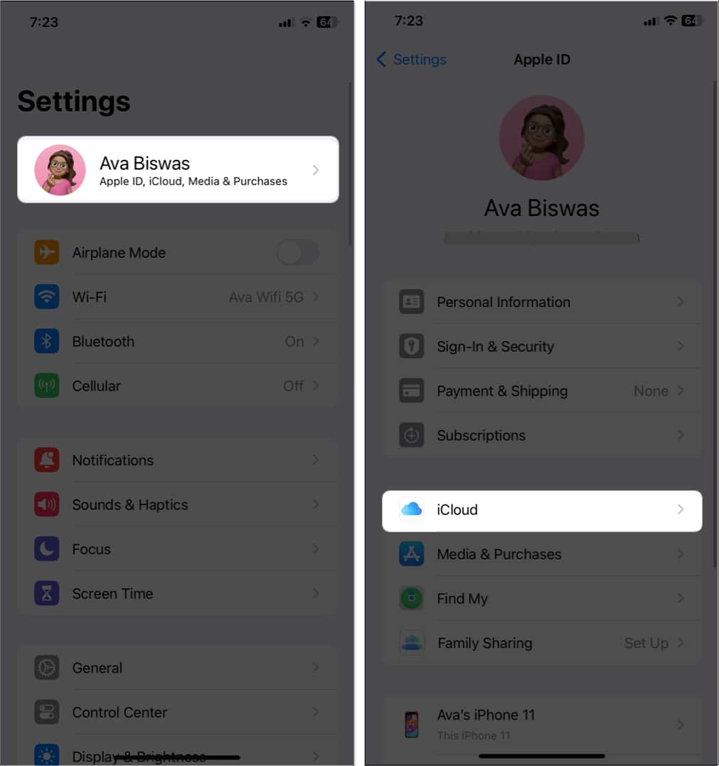 - پس از رفتن به Settings در آیفون، به ترتیب بر روی Apple ID و سپس iCloud کلیک کنید.