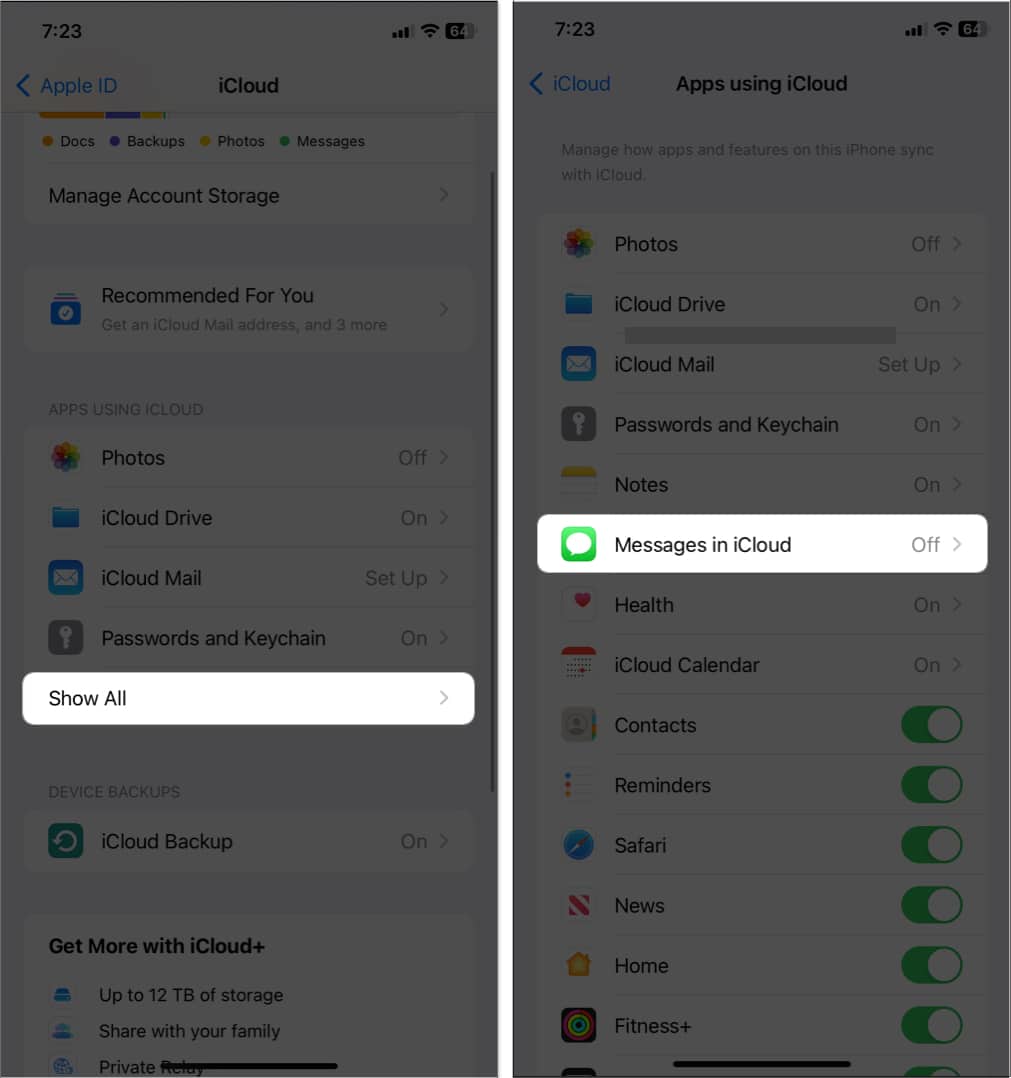 - Show All را انتخاب کنید و بر روی Messages in iCloud ضربه بزنید.