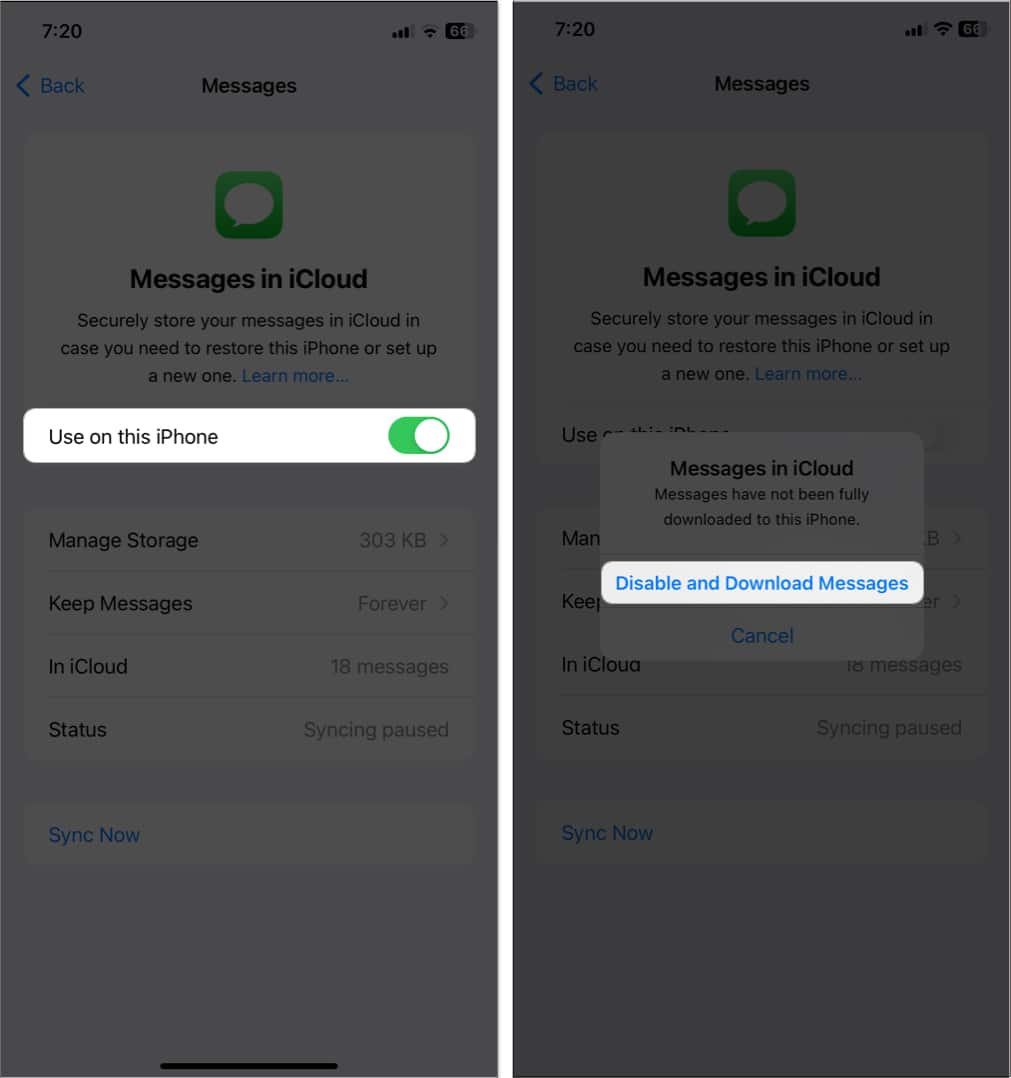 بدیهی است که اتصال و سینک دوباره آیمسیج به فضای ذخیره سازی ابری، کمک میکند تا iMessage تمامی دادههای خود را از آیکلود دریافت کند. این کار باعث میشود رسانههای پنهان و گم شده برنامه نیز بازگردد.